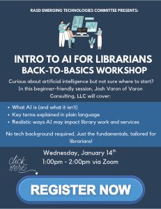 The RASD Emerging Technologies Committee will be presenting Intro to AI for Librarians: Back to Basics Workshop on Wednesday, January, 14th at 1:00 pm on ZOOM.
