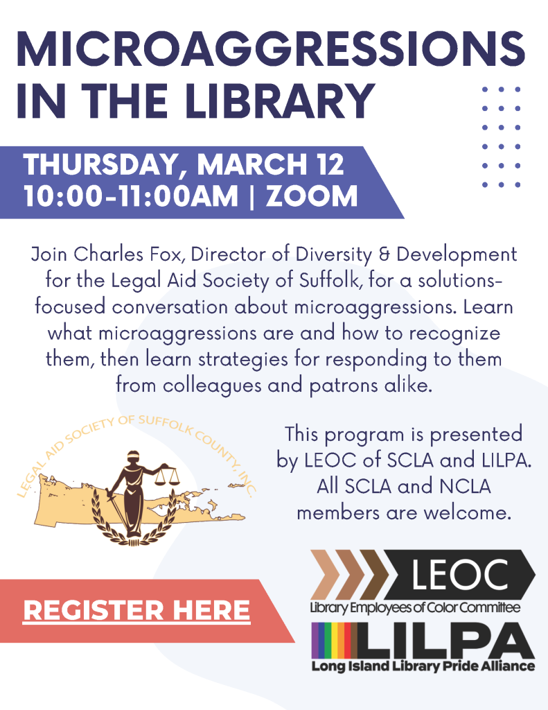 Join us for LEOC’s first program, presented in partnership with LILPA! Join Charles Fox, Director of Diversity & Development for the Legal Aid Society of Suffolk, for a solutions focused conversation about microaggressions. Learn what microaggressions are and how to recognize them, then learn strategies for responding to them from colleagues and patrons alike.