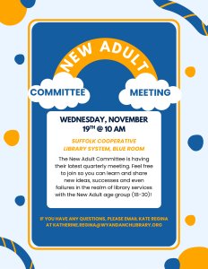 The New Adult Committee is having their latest quarterly meeting. Feel free to join so you can learn and share new ideas, successes and even failures in the realm of library services with the New Adult age group (18-30)!