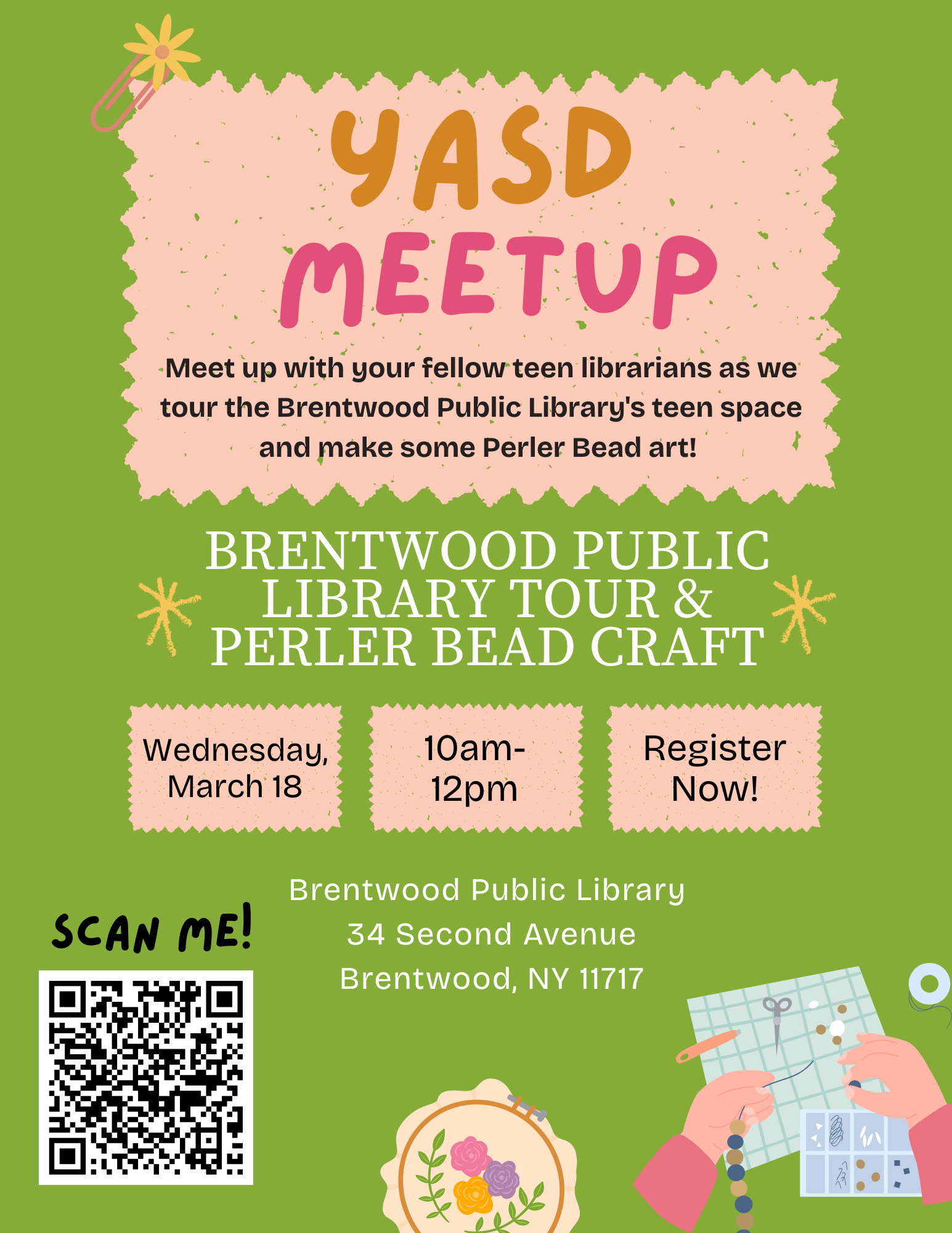 Join us at the Brentwood Public Library for a tour of the library’s teen space and relax with your fellow teen librarians as we make Perler Bead crafts and chat on Wednesday, March 18 from 10AM-12PM